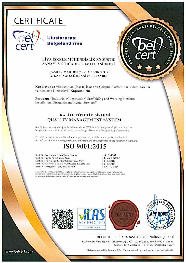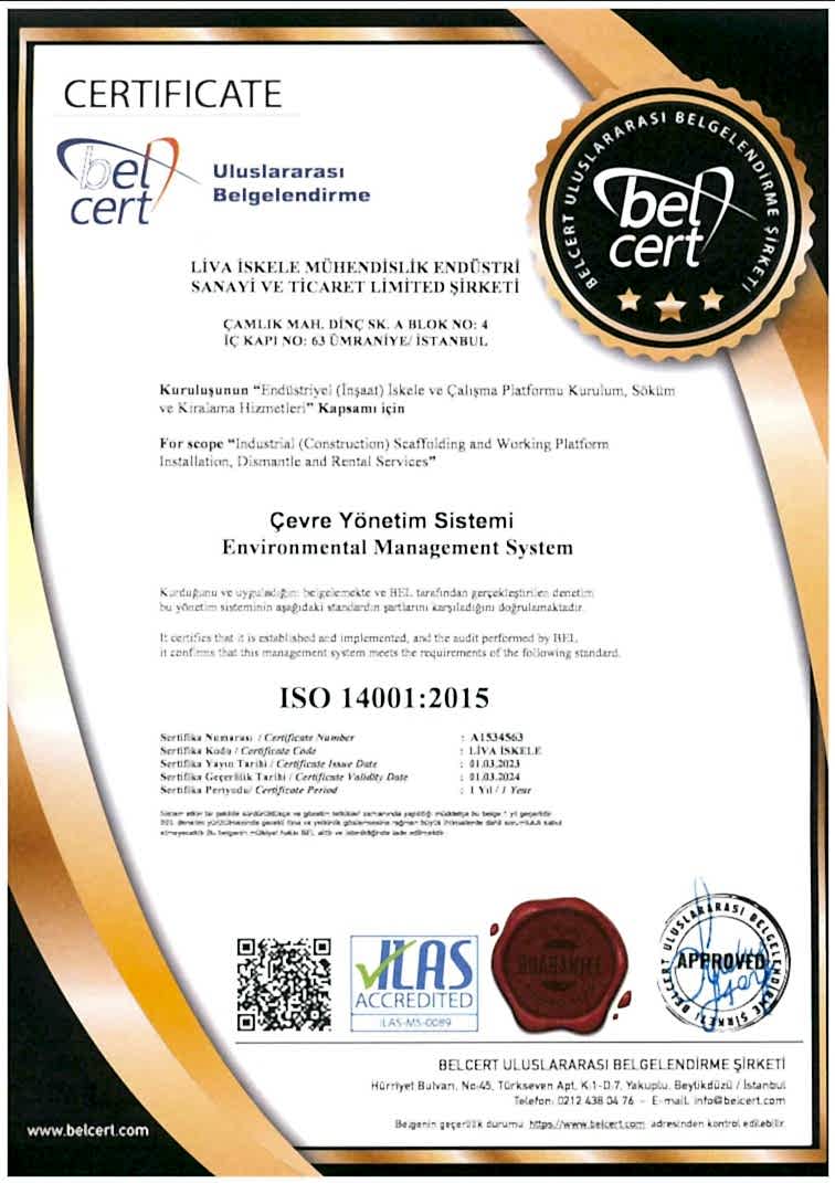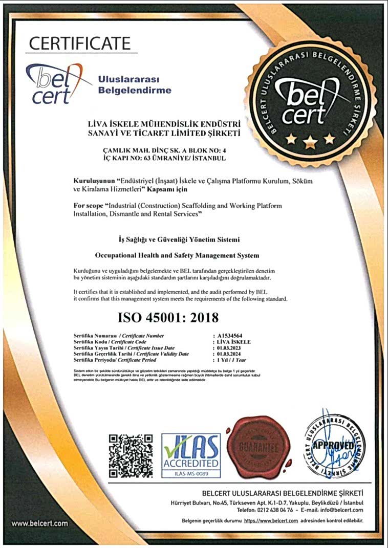 Liva Scaffolding uses scaffolding material certified in accordance with EN12810-EN12811 norms produced in international standards. Liva Pier, which realizes all stages with the vision of plan-build-manage all our projects with its expert staff in its field, leads the sector by showing maximum attention to HSE rules during its activities.